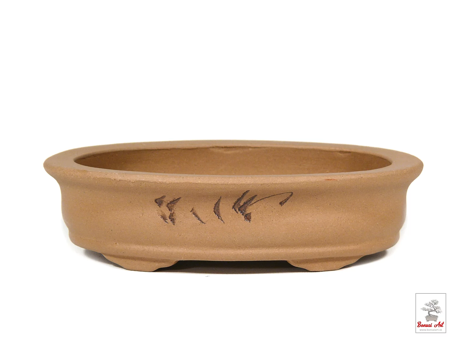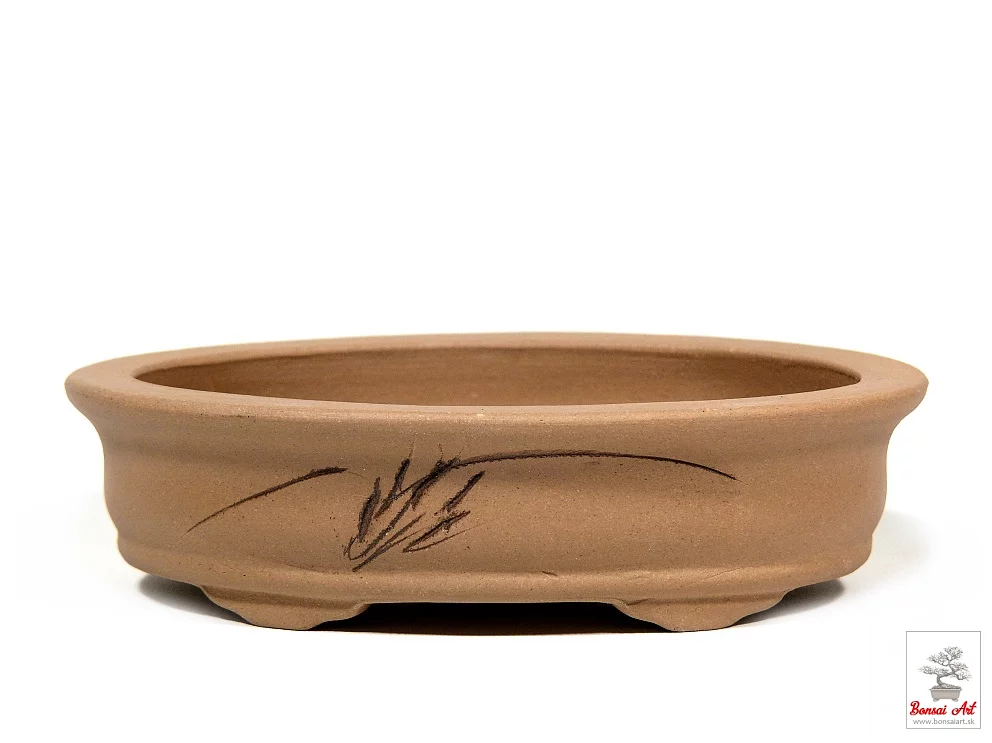 Oválna bonsai miska s jemným a hladkým povrchom. Má ručne vyrývané ornamenty s tmavou lesklou glazúrou na dvoch stranách a pekný rozšírený horný okraj zahnutý dovnútra pre udržanie koreňového balu. Miska je vhodná pre bytové aj vonkajšie bonsaje.