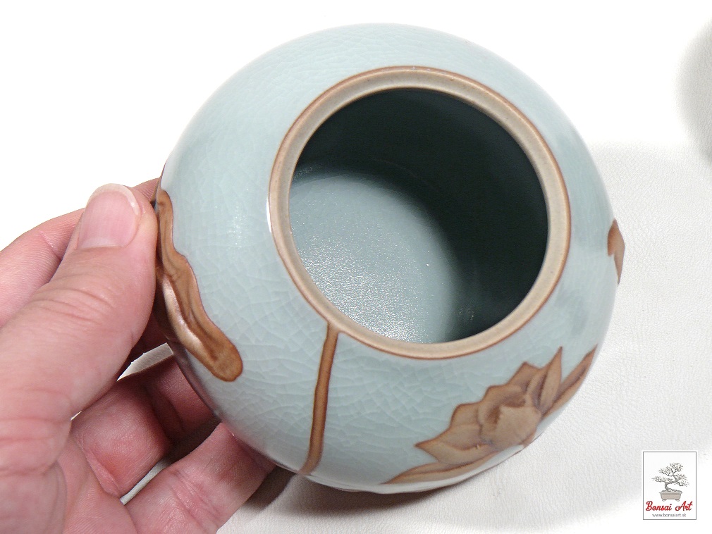 Roztomilá porcelánová dóza zobrazuje lotos kvitnúci na vode, ktorý je zvýraznený reliéfnym vyvýšením s matnou glazúrou. Povrch aj vnútro je pololesklo glazované. Sú to dve dózy, kde vrchná s viečkom pevne utesňuje spodnú. Viečko má šnúrku, gorálku a strapec. Pevné a vzduchotesné tesnenie s vrstvou pružnej tkaniny umožňuje dlhodobé skladovanie čaju, sušeného ovocia, korenia alebo inej suroviny, ktorá by sa mala skladovať s obmedzeným prístupom vzduchu. Tesní tak pevne, že sa môže dóza prenášať za šnúrku a nerozpojí sa. Vynikajúce spracovanie, jedinečný tvar a zaujímavá farba. Pôvod Čína.