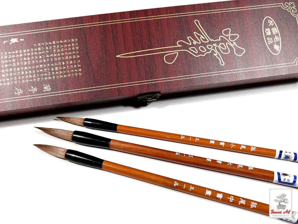 Sada troch rôzne hrubých kvalitných štetcov na klasickú čínsku kaligrafiu a maľovanie. Rúčky štetcov sú vyrobené z dreva, lakované s vyrytými znakmi, príjemne sa držia. Sada je v peknej drevenej kazete. Vhodné pre začiatočníkov aj profesionálnych umelcov. Pôvod Čína.